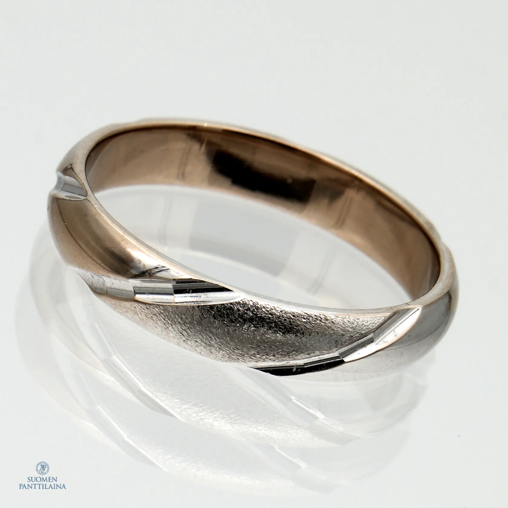 Kuvioitu sormus, koko 19, leveys 4mm, 750 valkokulta, Paino: 5 g.