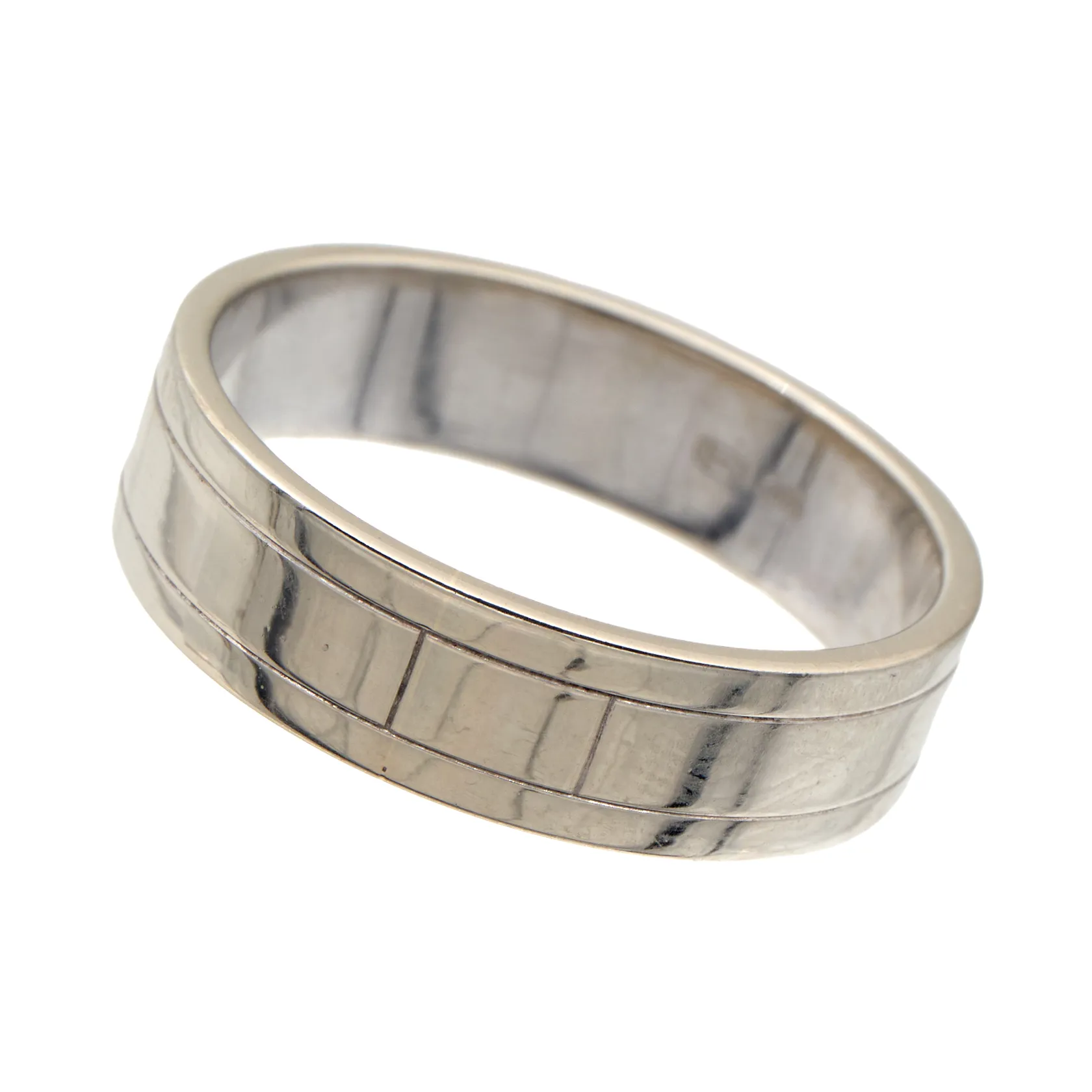 Kuvioitu sormus, koko 20¼, leveys 6mm, 585 valkokulta, Paino: 6,5 g.