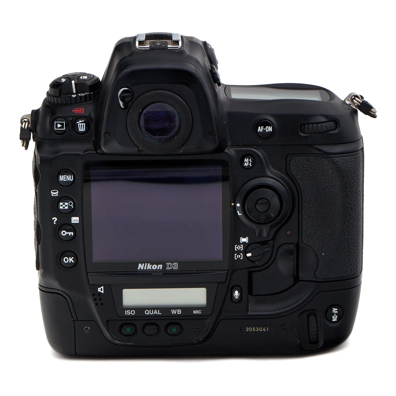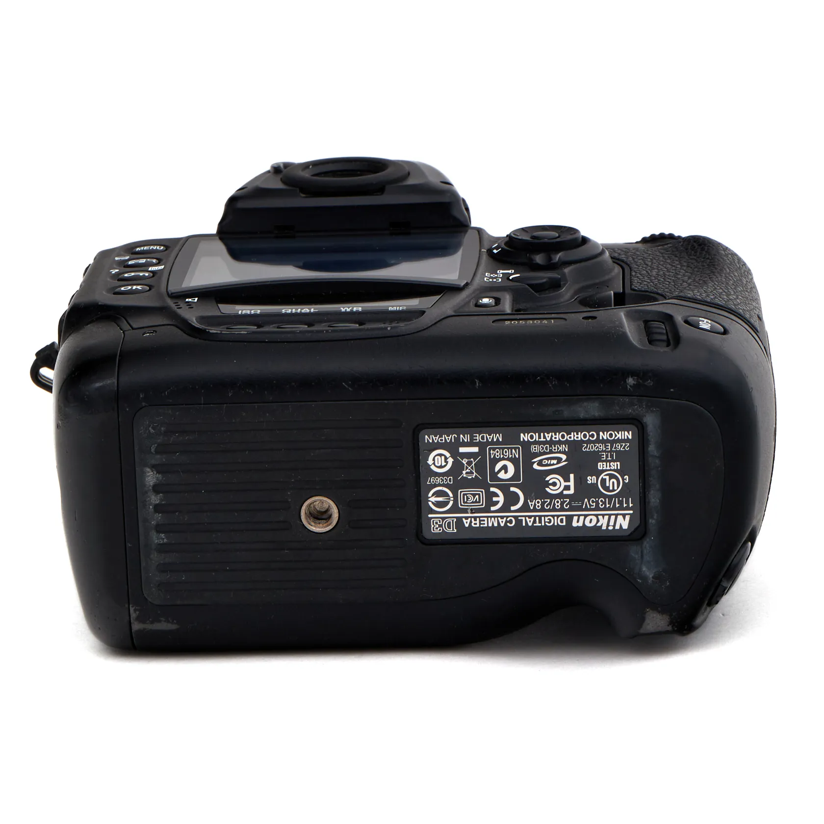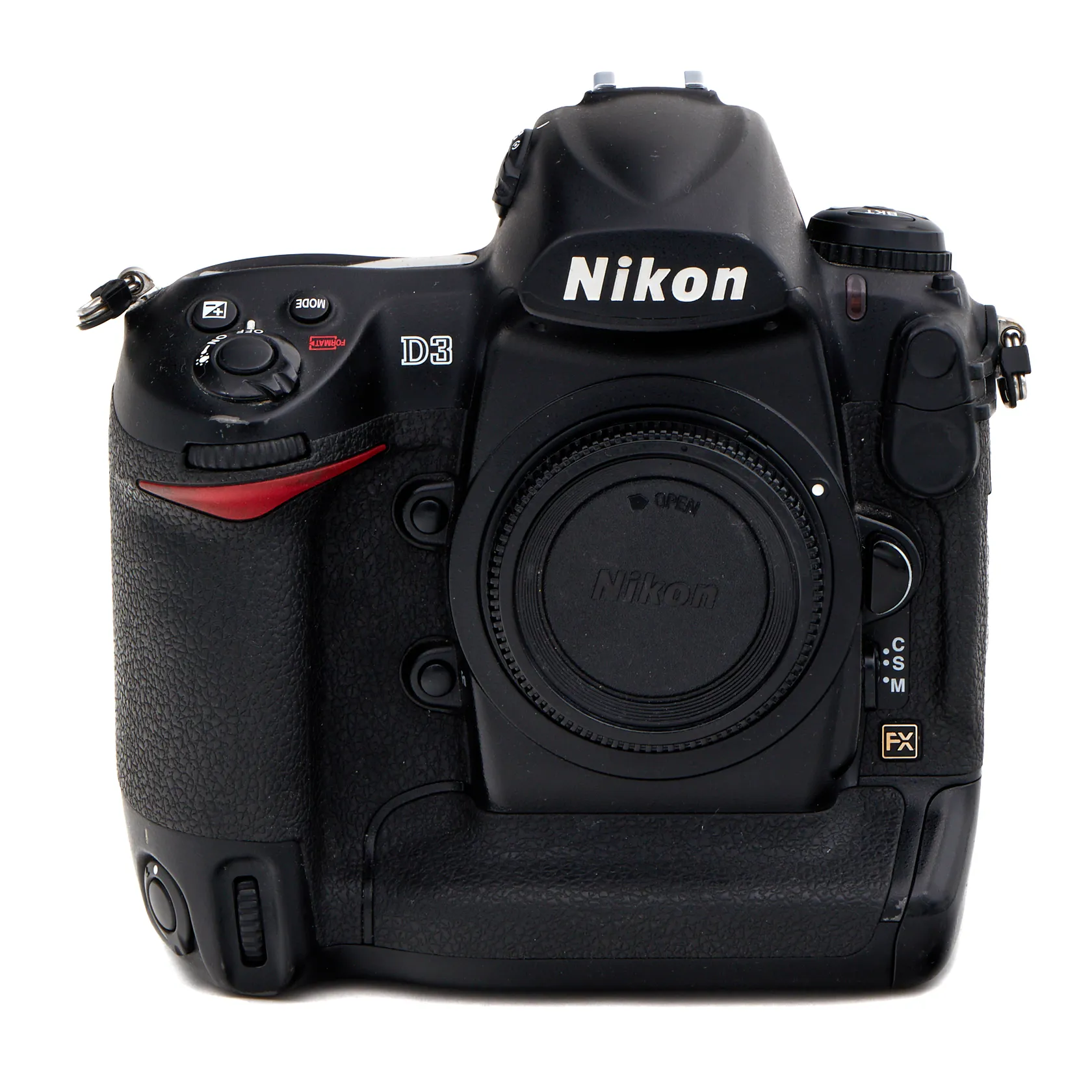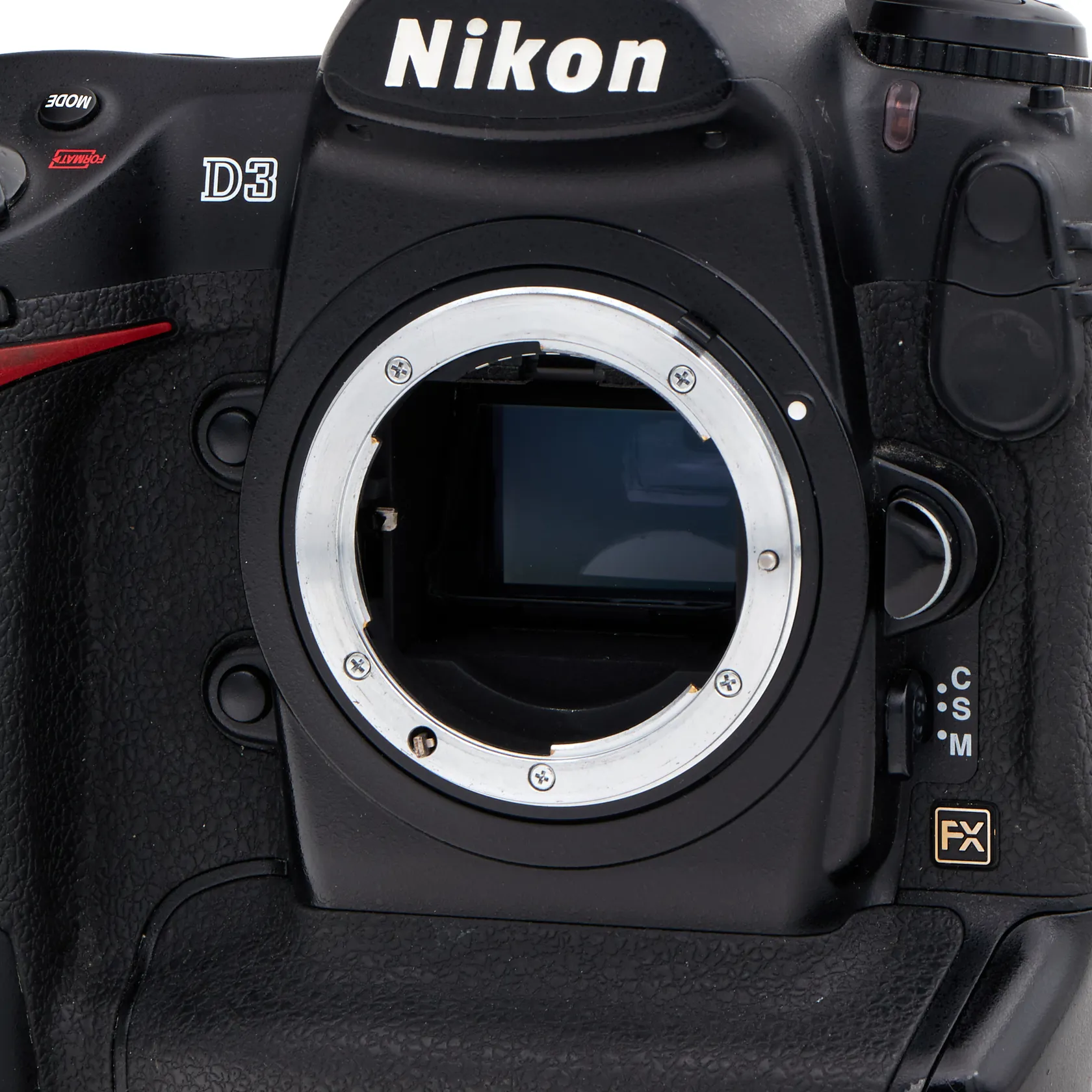 Järjestelmäkameran runko Nikon D3, mukana kantonauha.