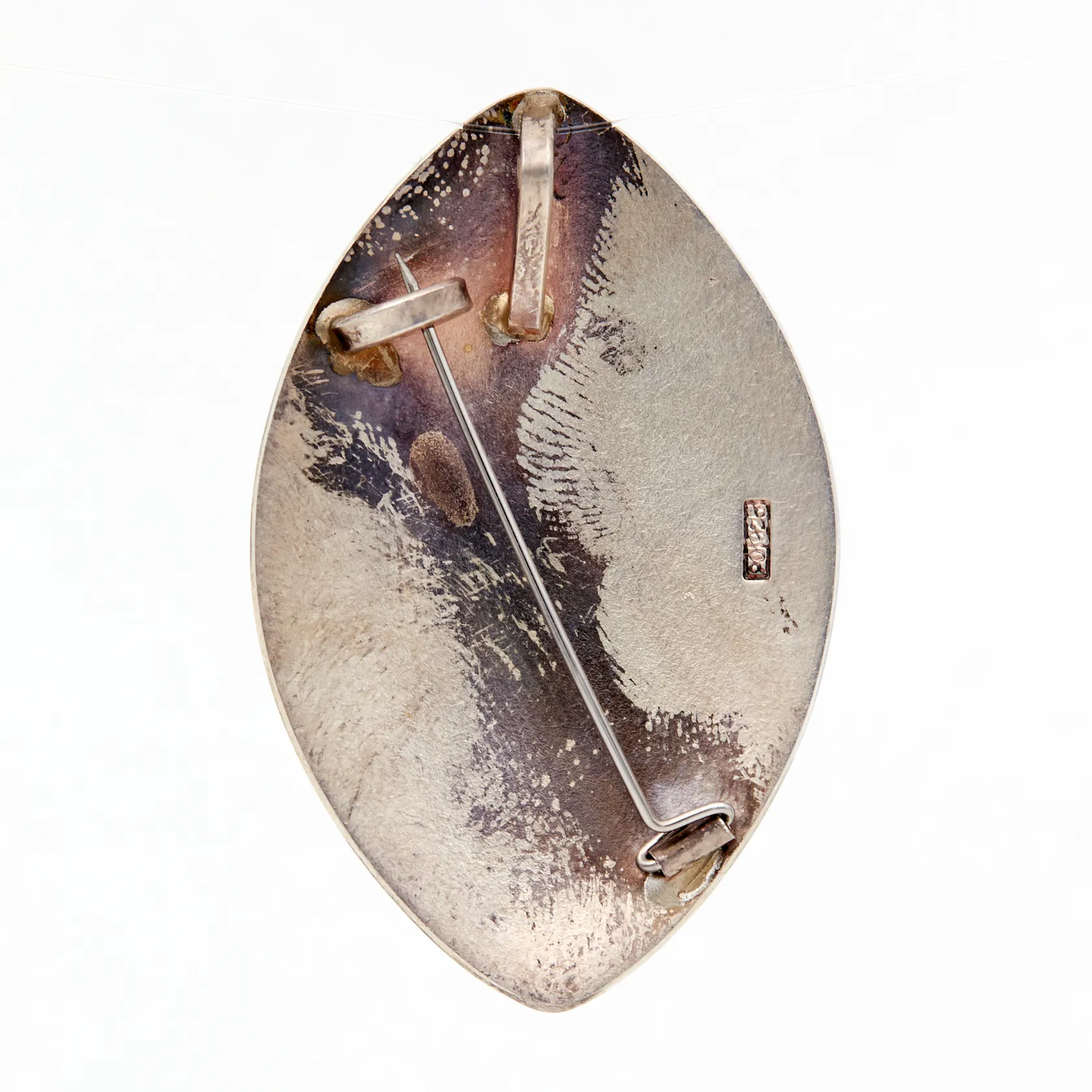 Rintakoru riipuslenkillä ja emaloinnilla, Marquise, design Pekka Piekäinen, pituus 48mm, leveys 30mm, nimileima Platinoro Oy, 925br, Paino: 19,3 g.