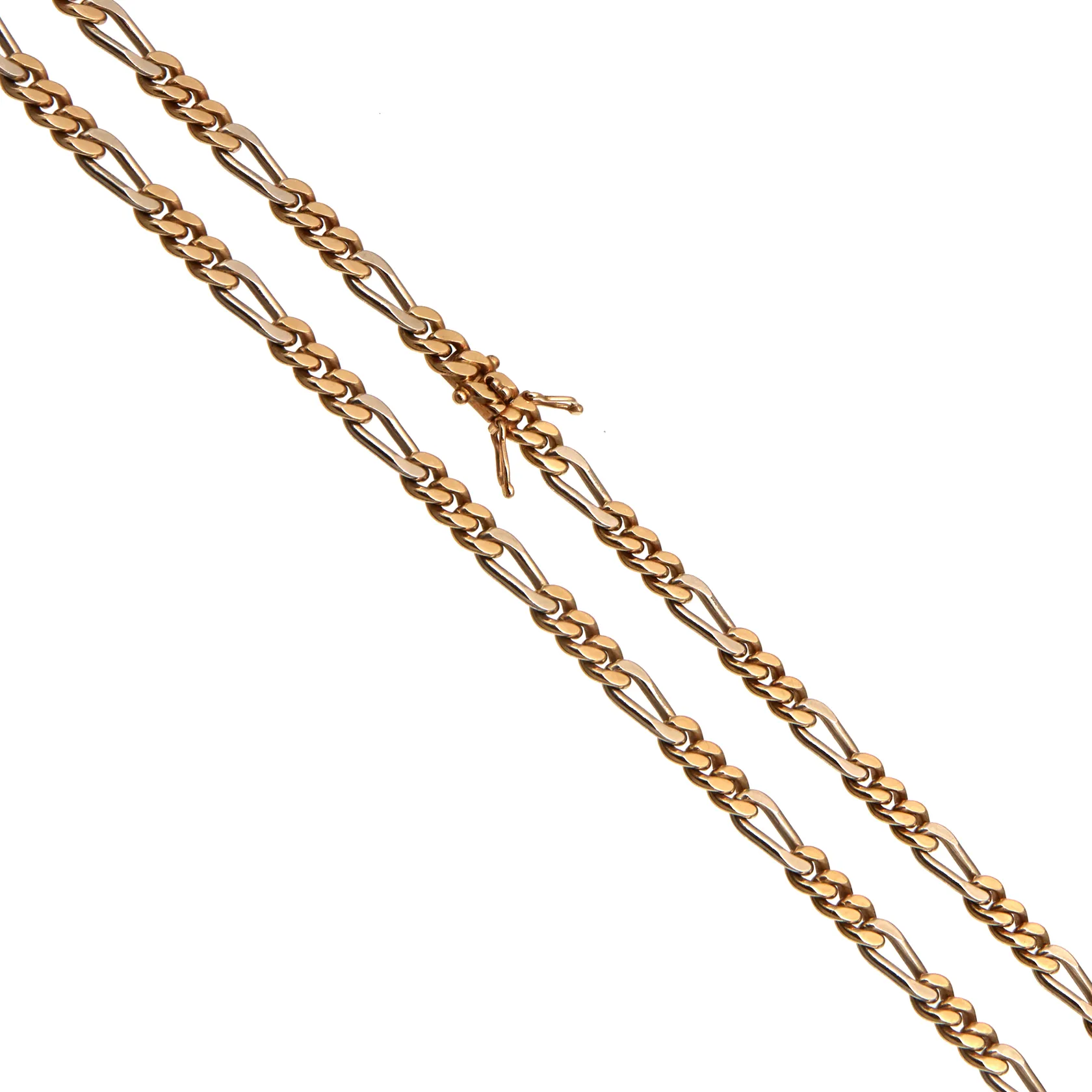 Figaro-kaulaketju, pituus 45.5cm, leveys 5.3mm, 585 valko- ja keltakulta, Paino: 41,1 g.
