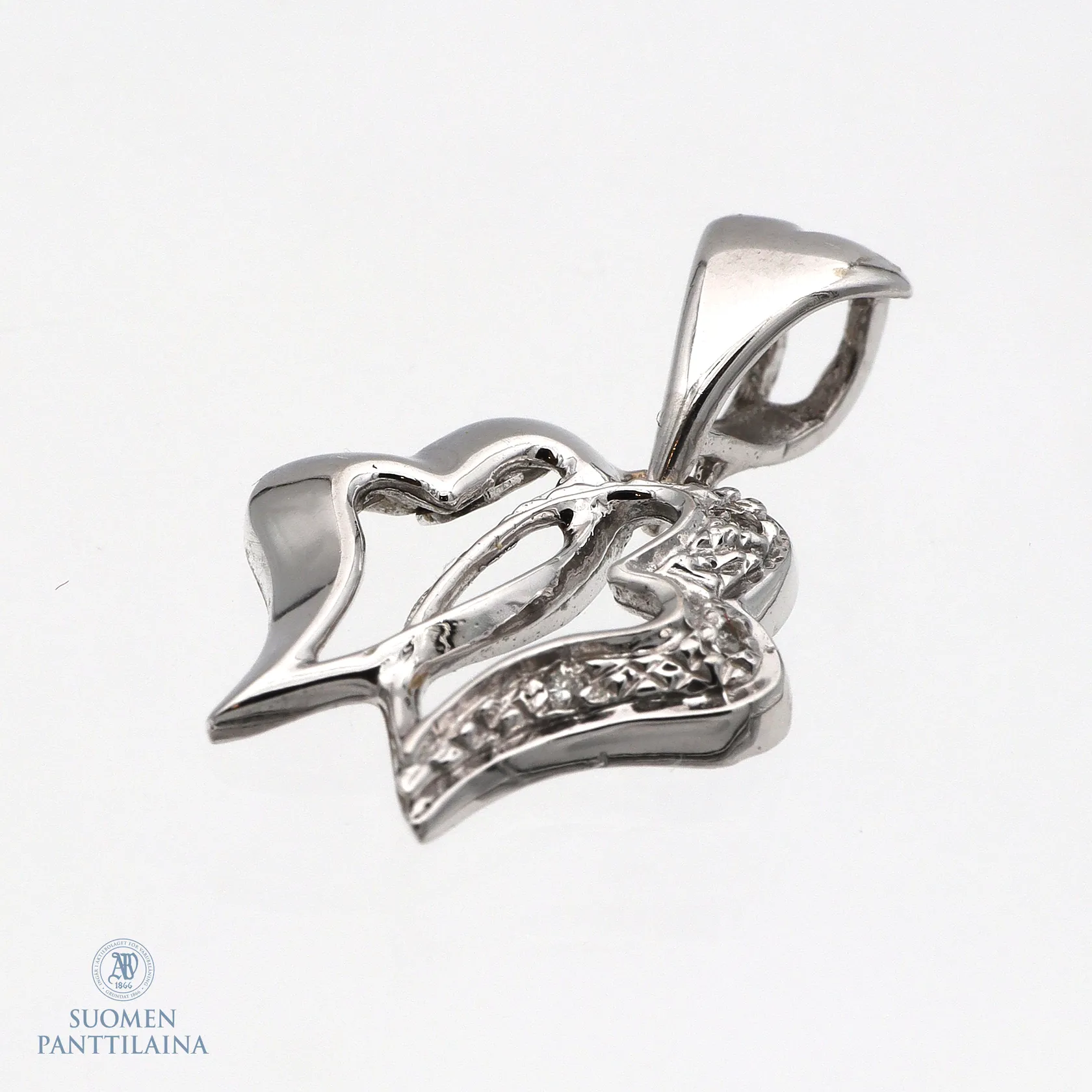 Sydän-riipus timanteilla 3xpieni timantti, korkeus 13mm, leveys 17mm, 585 valkokulta, Paino: 2,3 g.
