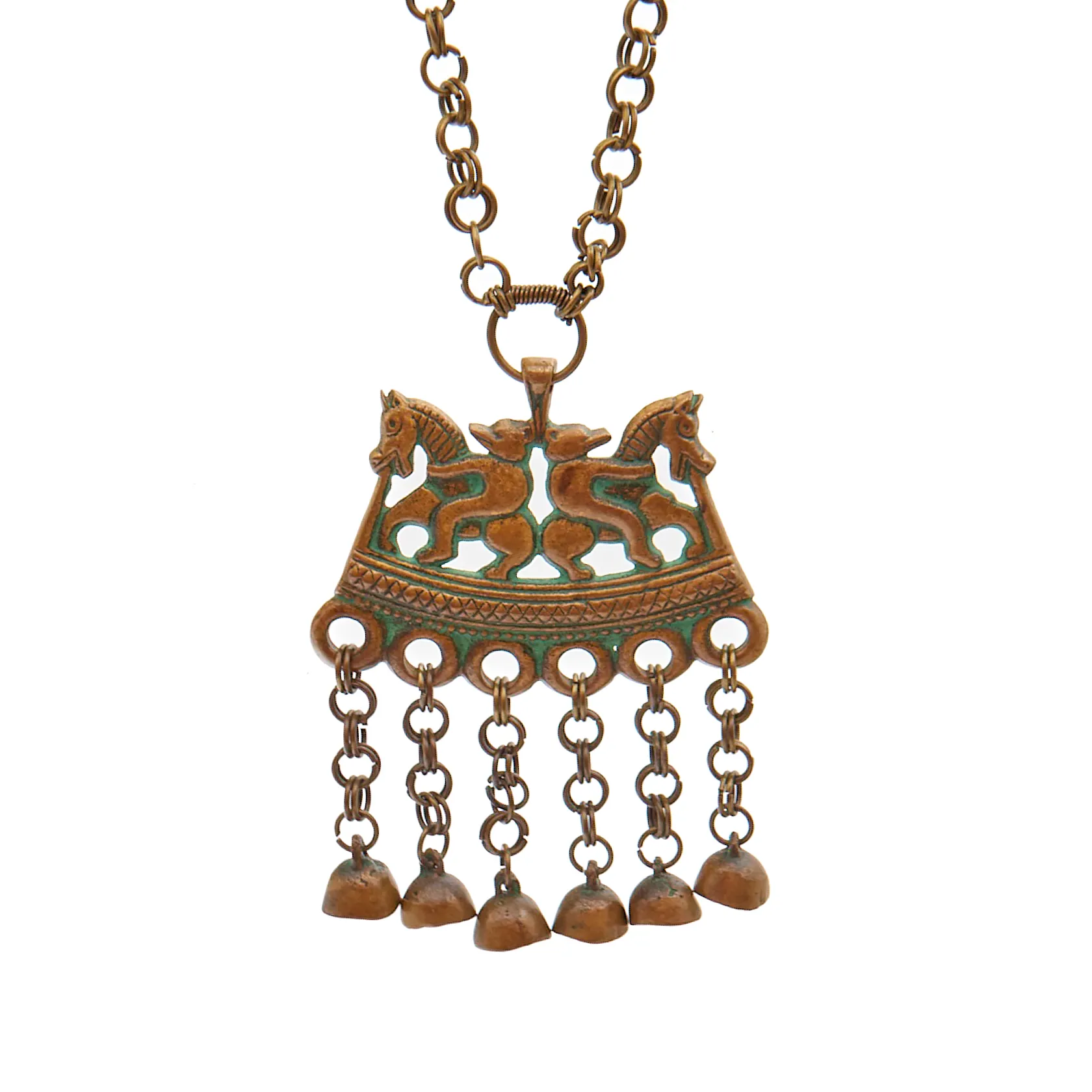Kaulakoru Kalevala, Kaksi Ratsastajaa, riipuksen korkeus 100mm, ketjun pituus 60cm, design Germund Paaer, pronssia.