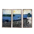 Kolme seinälautasta Arabia, Kesä sydämmissämme, yhden laatan koko 18x36cm, design Heljä Liukko-Sundström, triptyykki koostuu kolmesta laatasta nimeltään Laiturilla, Norppa ja Juhannuskokko, vuodelta 1997.